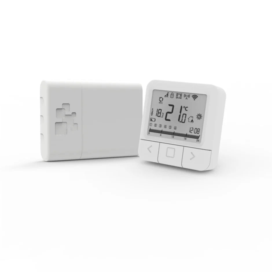 Dankzij de draadloze RF-communicatie (868 MHz) hoeft de thermostaat niet vast bij de ketel te hangen. U plaatst hem vrij in de ruimte voor een nauwkeurige meting of monteert hem strak aan de wand. De ontvanger wordt direct aangesloten op het verwarmingssysteem, wat zorgt voor een snelle en overzichtelijke installatie.