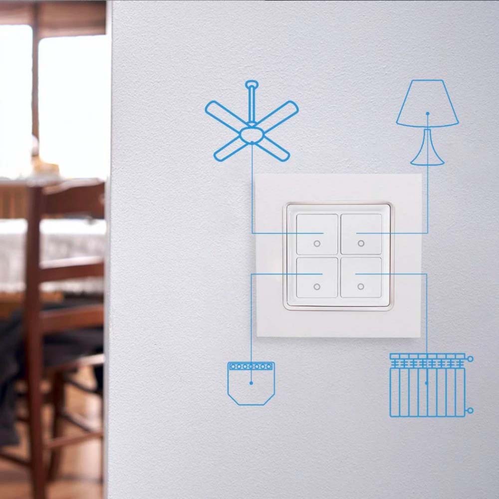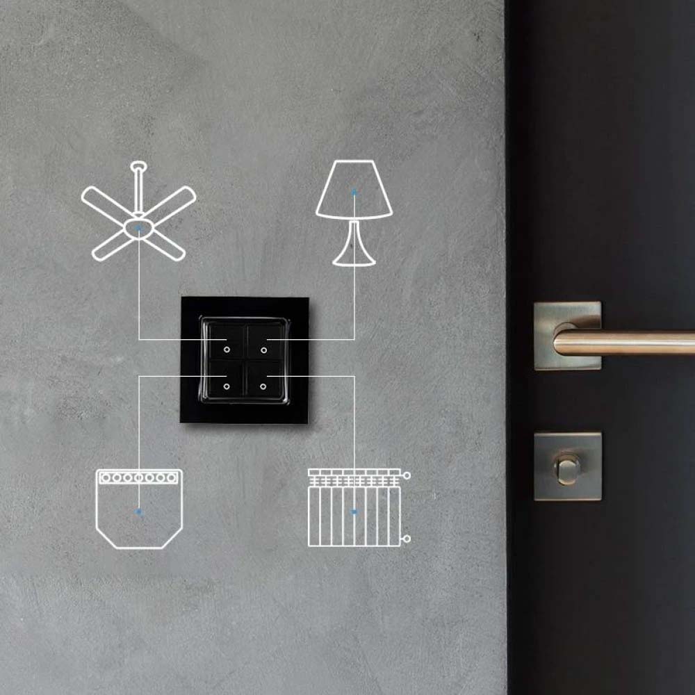Met de Wall Switch 4 stuur je moeiteloos meerdere slimme functies aan, zoals verlichting, dimmers, radiatorknoppen, rolluiken of zelfs een garagedeur. Dankzij de brede commandostructuur is deze schakelaar perfect geschikt voor complexe smart home scenario’s.